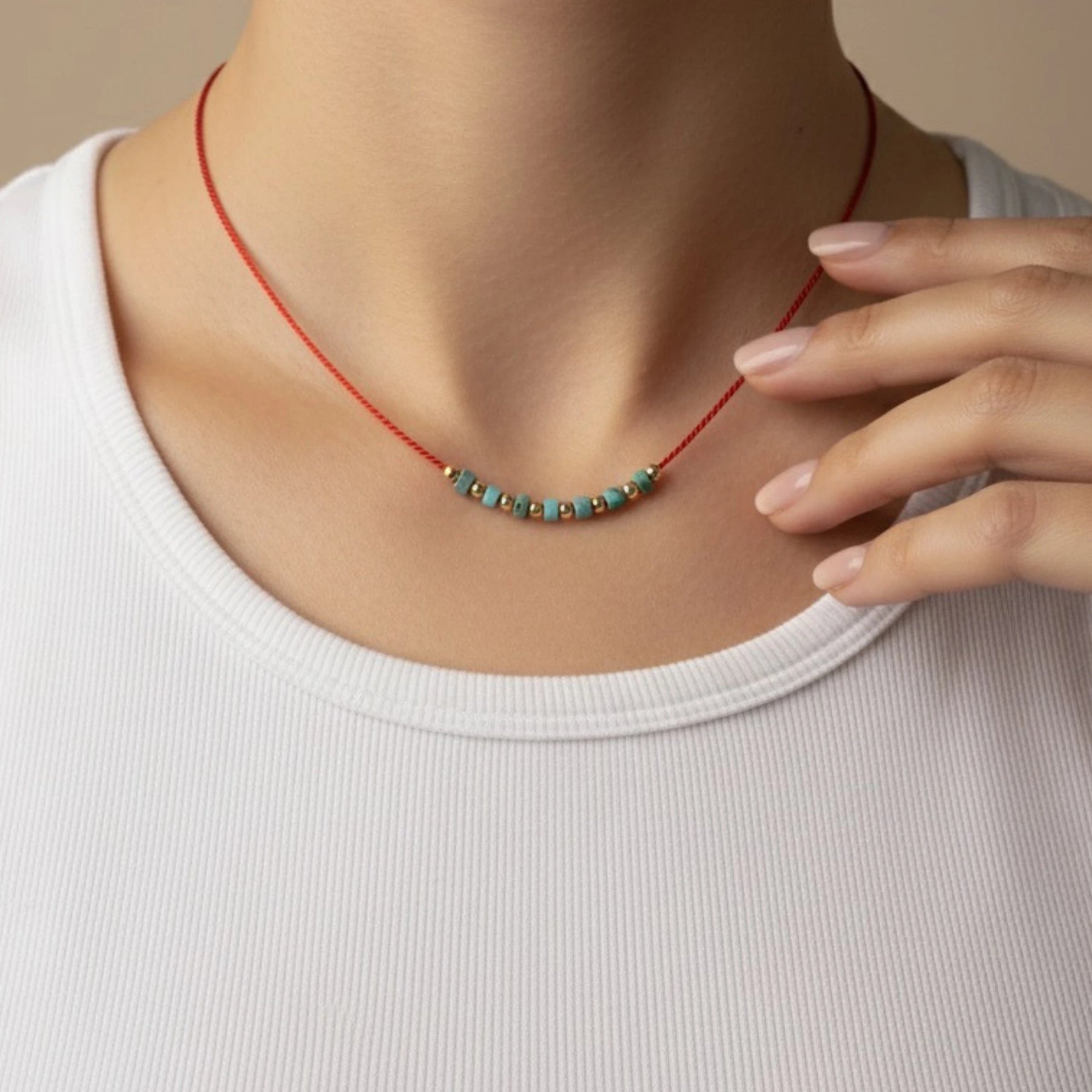 A woman wearing a dainty turquoise necklace with solid gold and silk red string.