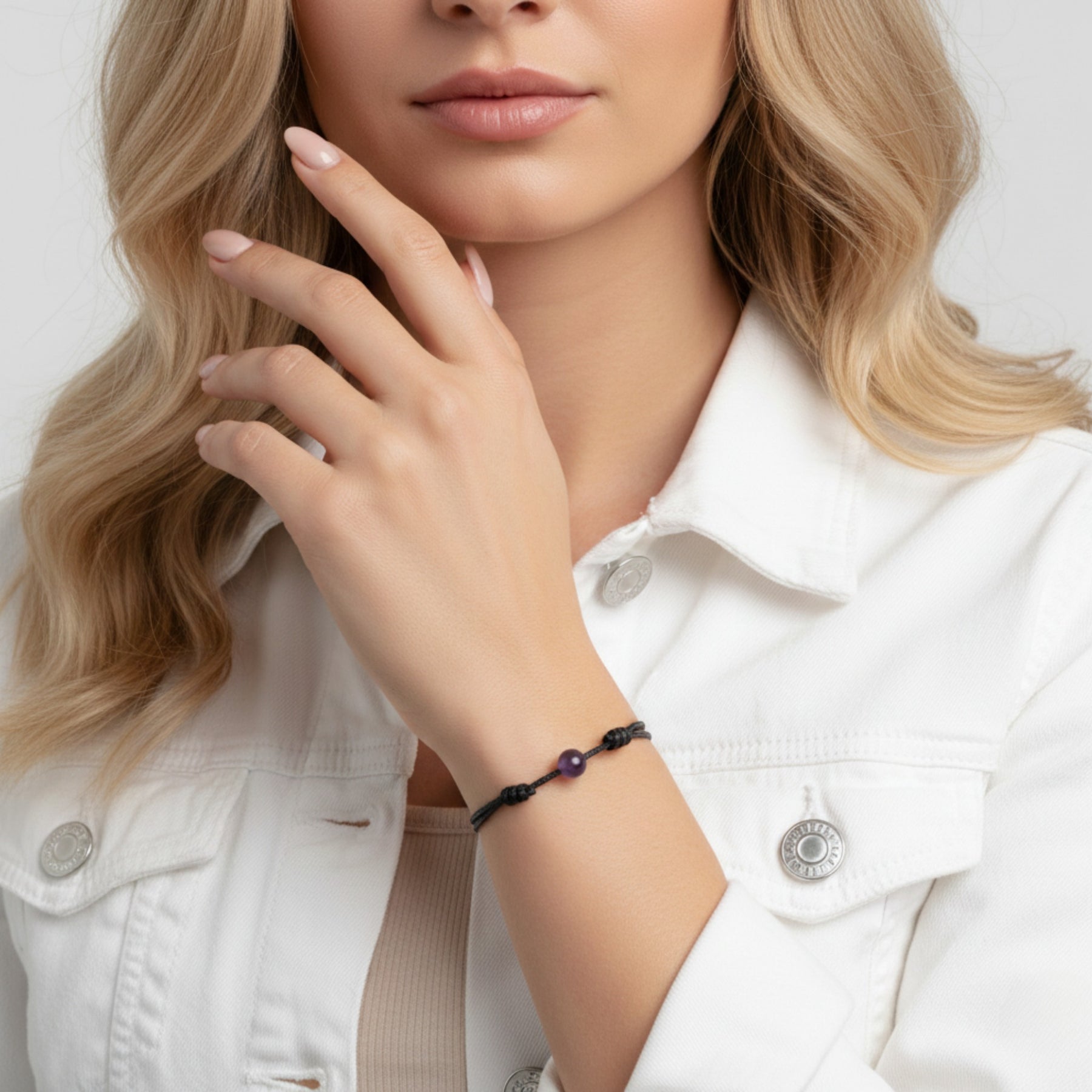 A minimalist bracelet designed for everyday wear, featuring a single natural [GEMSTONE] bead set on an adjustable waxed nylon cord. The clean composition highlights the stone’s natural character and refined detail.