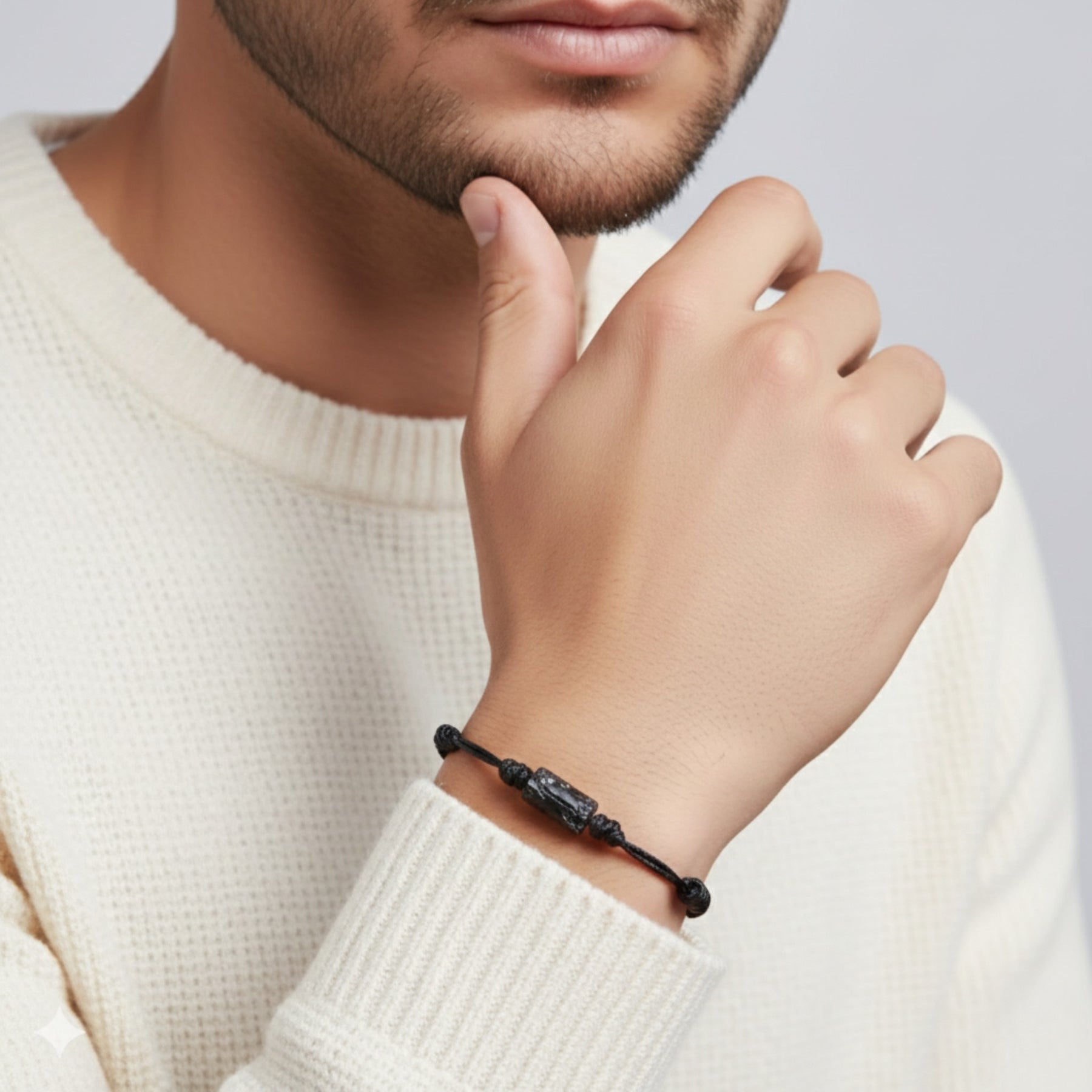 A bold bracelet designed with a raw, chunky black tourmaline stone as its focal point. Set on an adjustable waxed nylon cord, this piece highlights the natural, unrefined character of the stone and its strong visual presence.