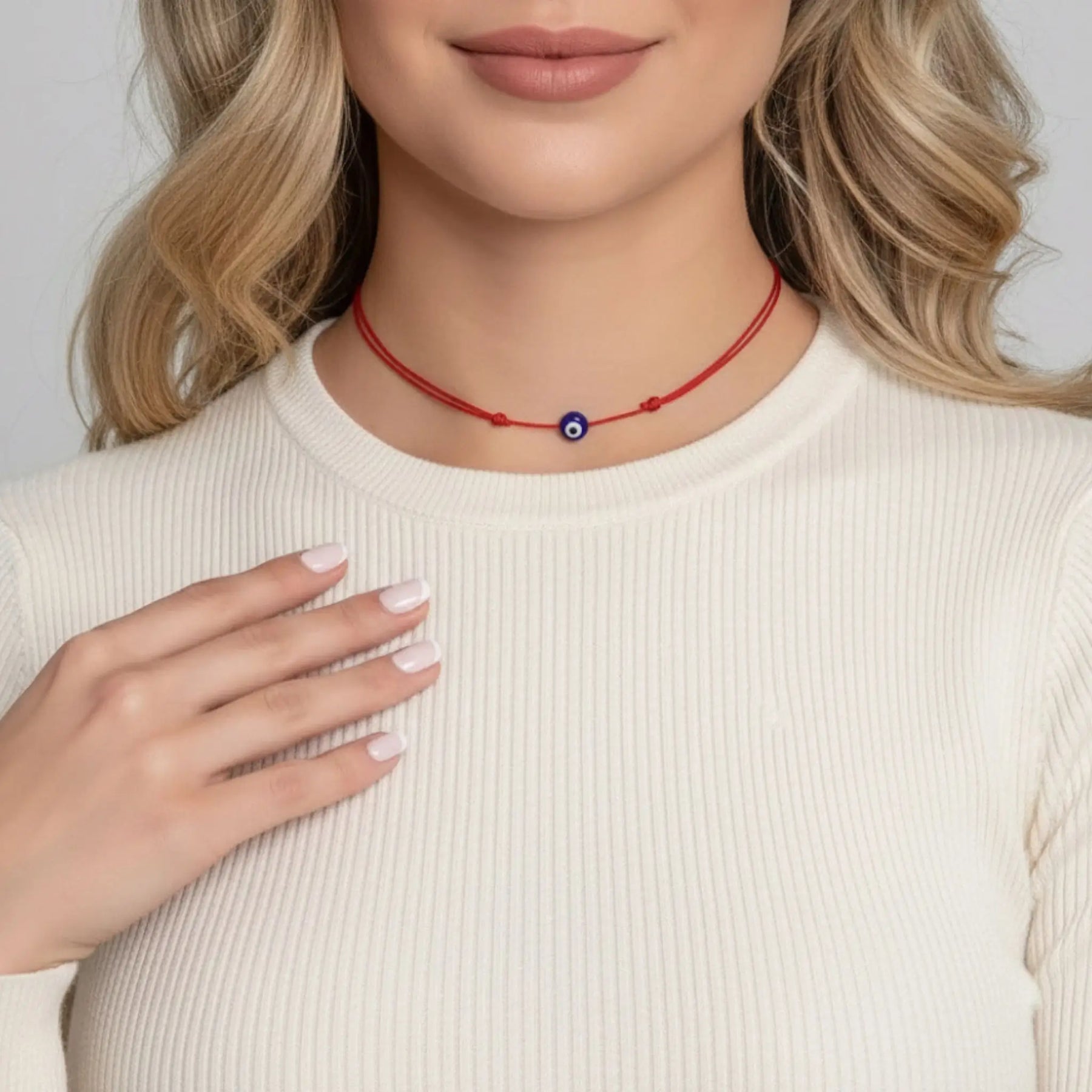 Woman wearing a red necklace with a blue evil eye pendant on a neutral background