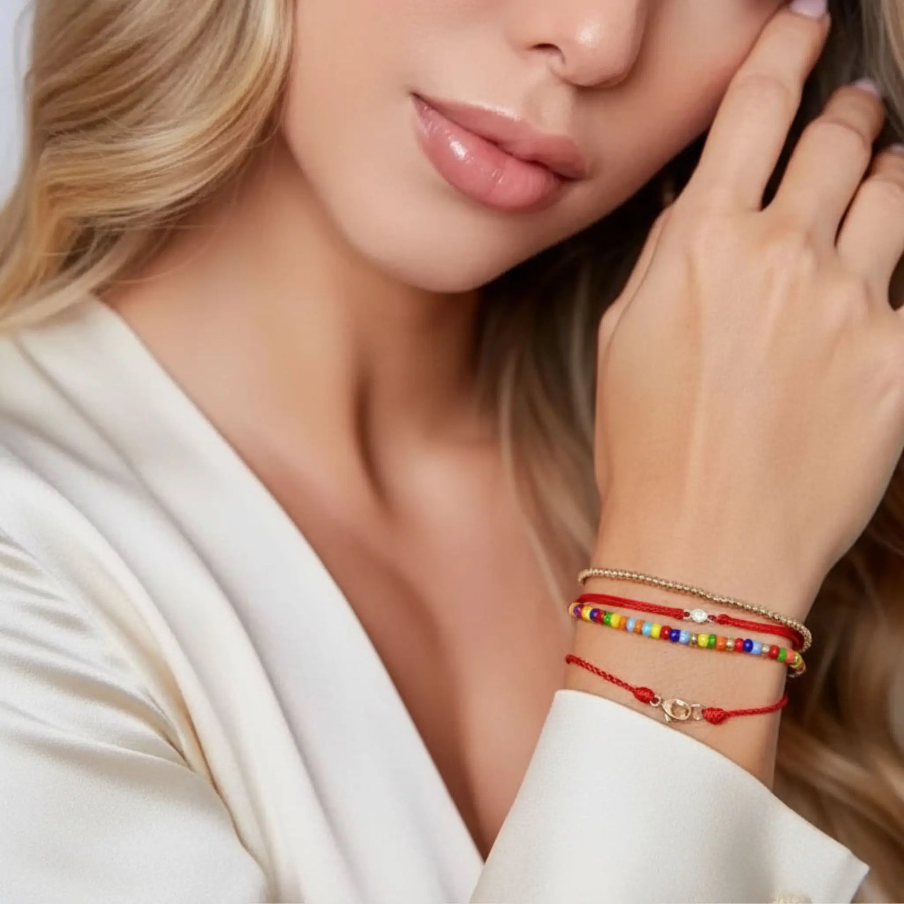 Close-up of a woman wearing a red bracelet with a small diamond, touching her hair against a neutral background.