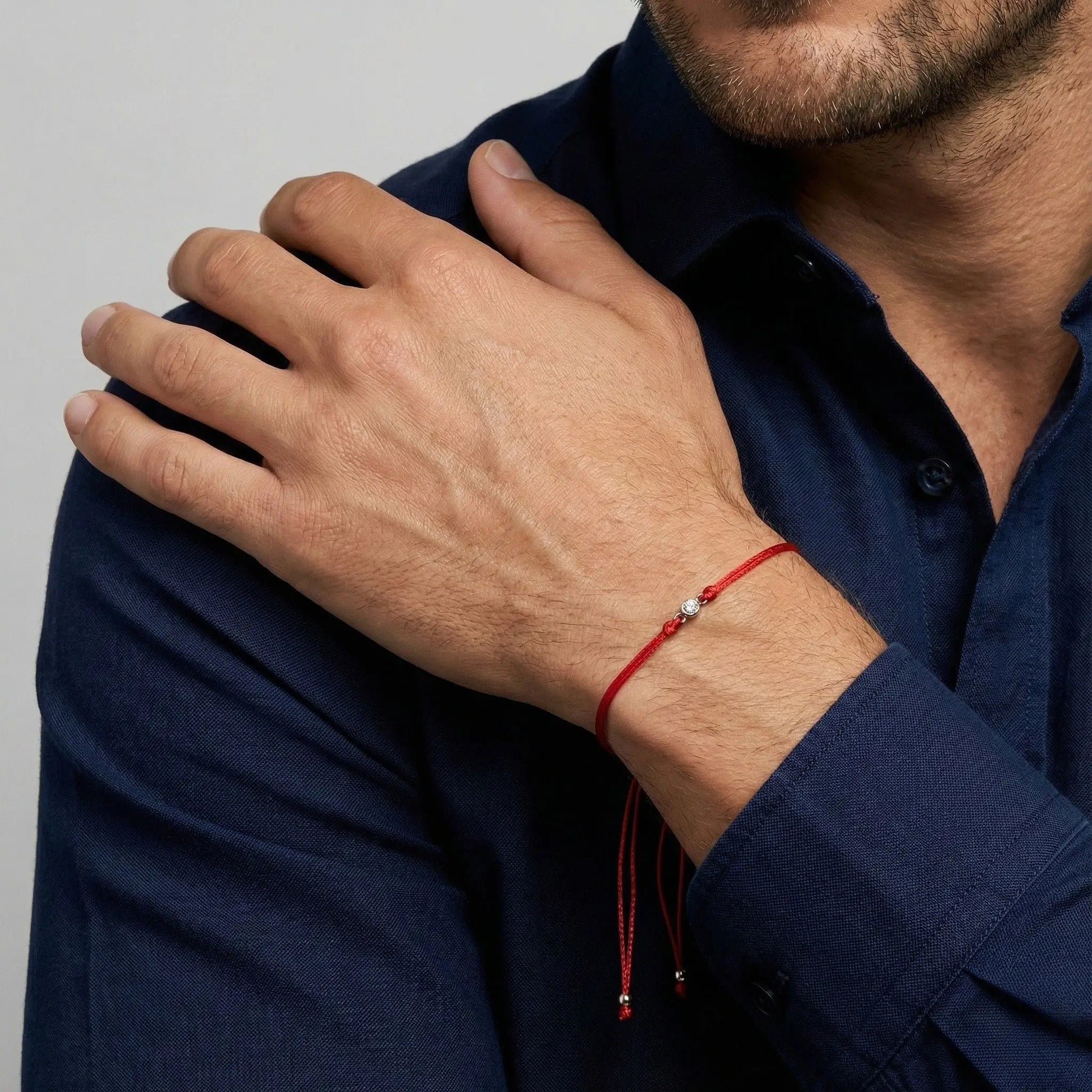 Close-up of a person wearing a  diamond red string bracelet on a plain background