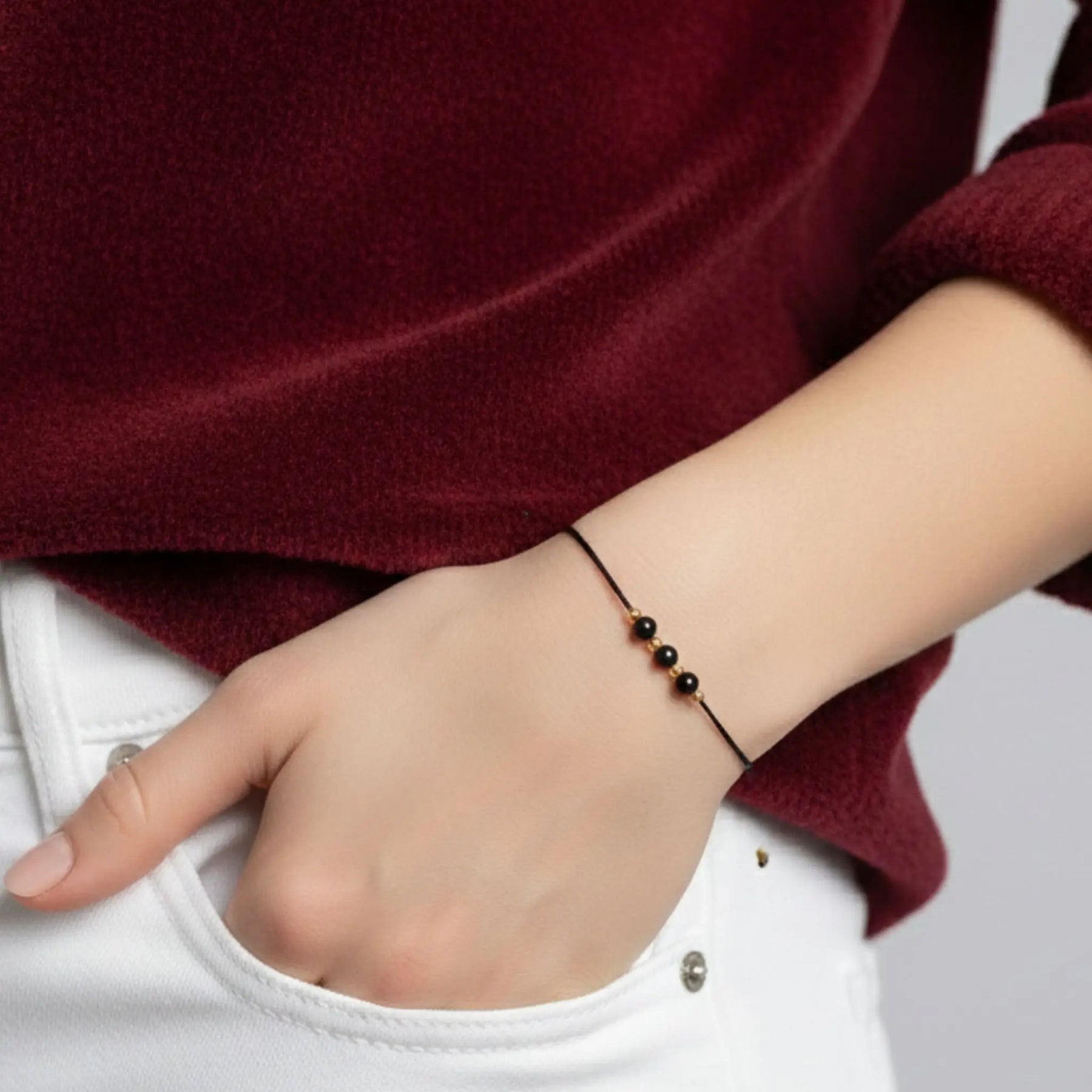 14K Gold & Black Tourmaline Red String Bracelet pairs polished black tourmaline beads with solid 14K gold accents on a vivid red cord. In crystal and red-string traditions, black tourmaline and red cord are often worn as symbolic reminders of protection, grounding and good fortune rather than promises of results.