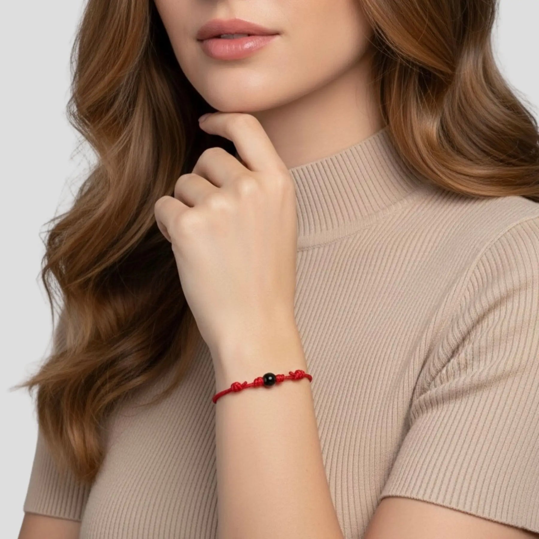 Woman displaying the Luck Strings Energy Shield Black Tourmaline Bracelet, a symbol of protection and fortune.