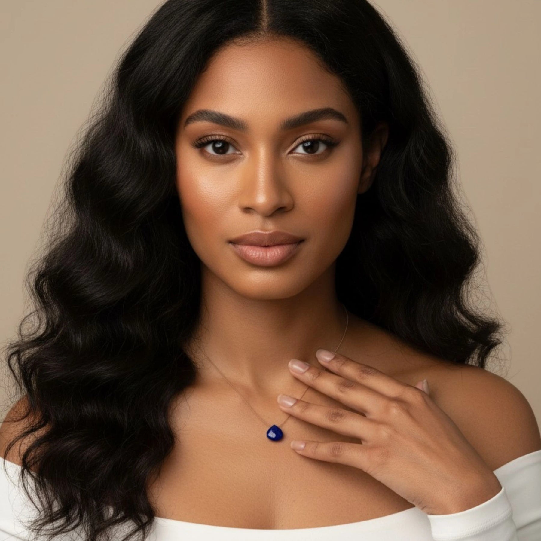Woman wearing a necklace with a lapis lazuli pendant against a beige background