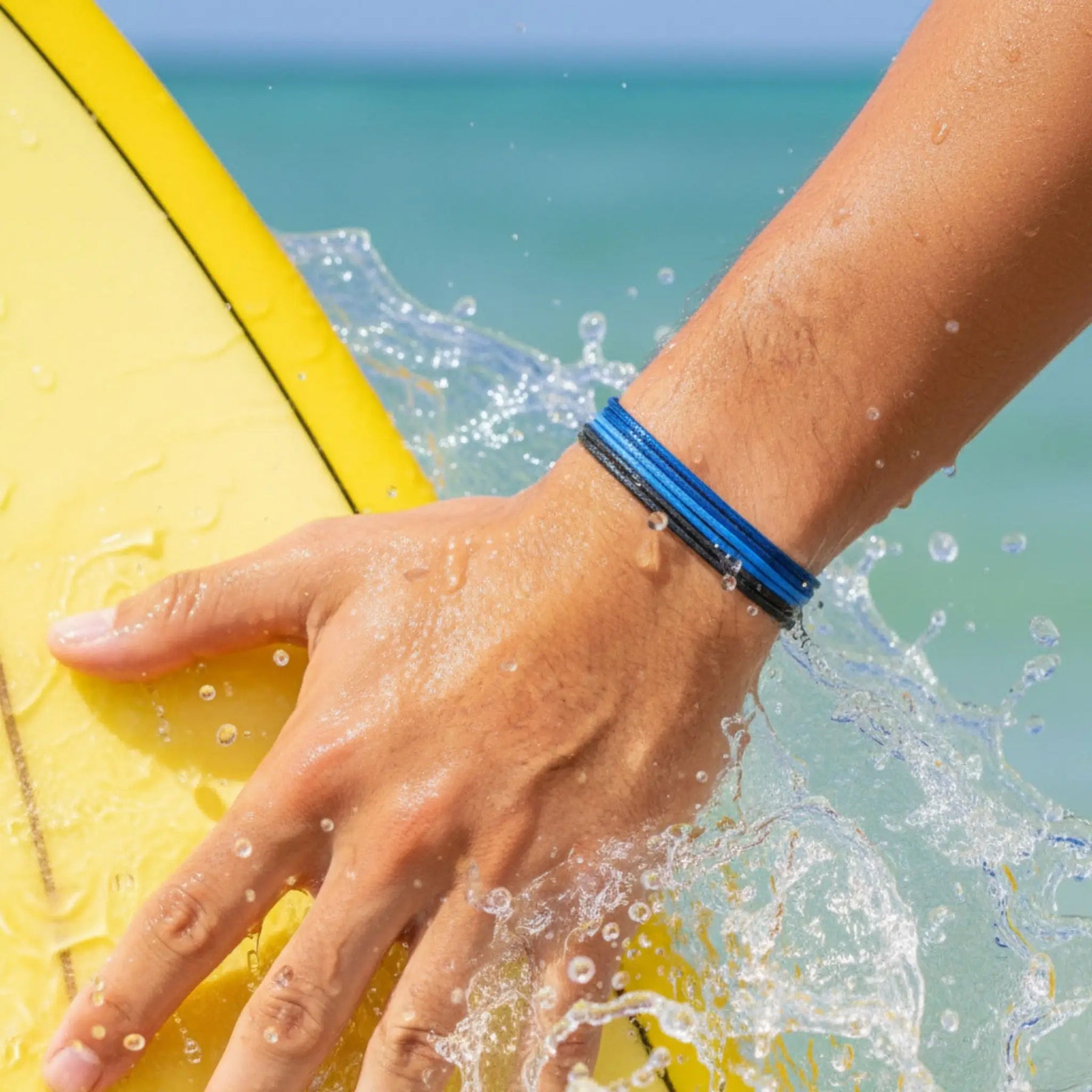 Hand holding a yellow surfboard with water splashing, wearing a blue and black bracelet.